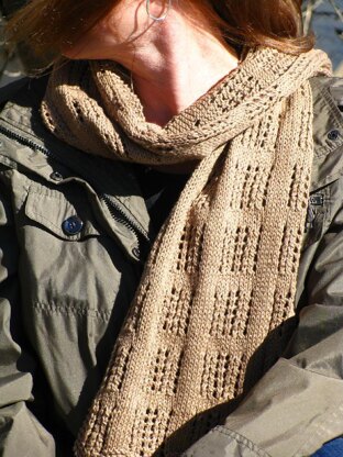 The Grove Park Scarf is an easy to memorize lace pattern that works well with yarns having a crisp texture. Inspired by the Art Deco architecture of Asheville, in particular the Grove Park Inn, this scarf is reminiscent of Mission Style furniture, making it an ideal unisex pattern. Both chart and written instructions are included. Size approximately 8.5” wide, 68” long.