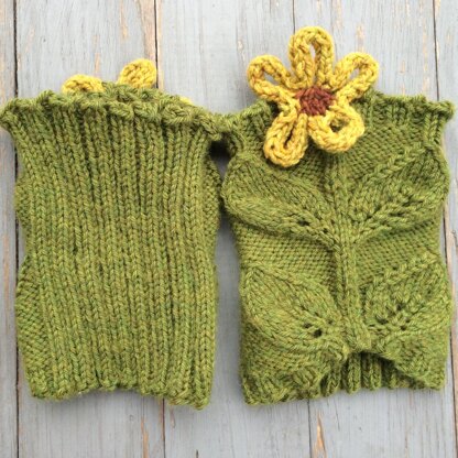 Enjoy these leafy, lush boot-tops with three no-sew flowers! The pattern has both written and charted instructions, and includes 3 optional mix and match flowers. Not interested in boot cuffs but like the idea? Just keep knitting, and end up with legwarmers.