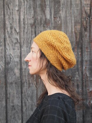 This slouchy hat is named for the French quotation mark << >>, the guillemet. Simple knits and purls create a chevron pattern reminiscent of this handsome punctuation. The hat is finished with an interesting decrease that makes a circle detail. The Guillemet Hat’s construction starts with knitting the band lengthwise until it fits comfortably around the head. The band is neatly joined and the edge picked up for continuing with the crown of the hat. This method of construction means the hat can be made to fit any size head, with any yarn, with no need for pesky gauge swatches! US raised and produced Fancy Tiger Heirloom Romney gives a rustic look to this textured hat.