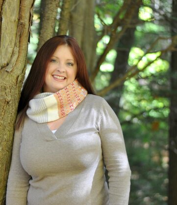 Guyandotte Cowl is worked entirely in the round beginning with a provisional cast on. The pattern features one round stripes and stranded colorwork. The provisional cast on is undone and the ends of the cowl are joined by Kitchener stitch.