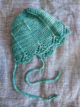 Gwen was inspired by the birth of my neice, Gwen River. It is a sweet baby bonnet knit from the front edge featuring a scalloped lace edge and slipped stitch garter body. The body is knit flat and joined in the round to shape the crown. The ties are knit using i-cord and applied directly to the bottom edge as you knit.