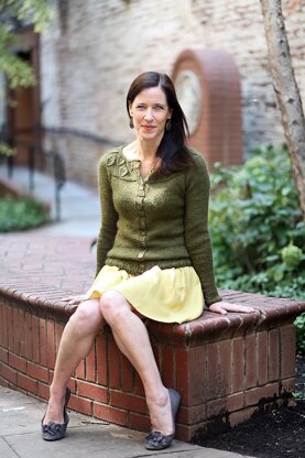 The inspiration for this design came from the yarn, Shibui Staccato and Silk Cloud. It is such a beautiful shade of green, it makes me think of a woodsy forest during the time of Camelot. So a cardigan named Gwenevere with leaves seemed appropriate. The cardigan is worked from the top down in one piece beginning with a rounded yoke that has leaves on a purl background. Raglan increases are worked to shape the bodice. There is short rows across the back so that the front neckline hangs a little lower than the back neckline. And there is waist shaping. The body of the cardigan is worked in Stockinette Stitch with a leaf border at the bottom followed by a ribbed band. The button bands and the neckline are worked with a vertical rib from picked up stitches. The arms have the same leaf border and ribbing as the bottom of the sweater.