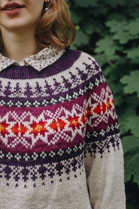 Gwiazda, which means star in Polish, is a top down seamless yoke sweater with a deep colorwork chart that uses stars and diamonds to create a striking yoke. The neckline features double ribbing with integrated increases and is followed by short rows at the back of the neck to create a comfortable fit. This is followed by stranded knitting that is worked in multiple colours. The chart continues past the arm and body divide for almost all of the sizes. The sleeves are knit in stockinette stitch and the cuffs and body are finished off in double ribbing. The body has optional waistline shaping for a flattering fit.