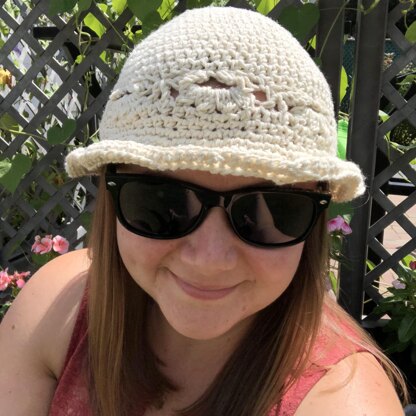 This hat was inspired by one I saw someone wearing while I was on vacation in Hague, NY, a little town on Lake George. It’s a fun alternative to a big-brimmed sun hat. I really enjoy the look of the curled brim! This hat has a simple top-down construction with a pretty lace section.