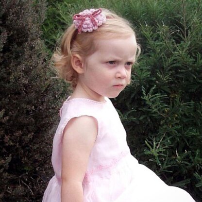 Materials: • Fingering or sport weight yarn in color of choice for flower – small amount • Fingering or sport weight yarn in color of choice for crocheted ribbon – small amount (Alternatively you may use fabric ribbon.) • Crochet hook size F (3.75 mm) or similar