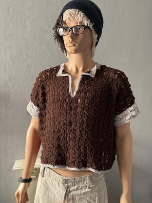 This crochet pattern is for a man’s top, with a striking Half Moon crochet shell design. The design is for an oversized shirt that hangs over the shoulder. The front can be fully closed, half open, or fully open. Add sleeves, or not, the choice is yours.