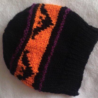 Have some spooky fun with this bat beanie hat. A great way to keep warm while out trick or treating. Turn the rib up for a thicker brim, or leave it down, two looks one hat A fun hat you could where all winter long. Worked flat on two needles, a written pattern that comes in 3 sizes.