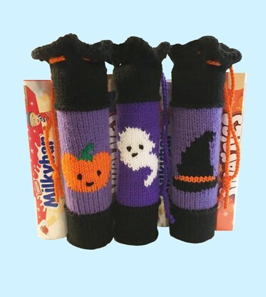 Each bag uses less than 20g DK yarn, knit on 3.25mm straight needles. The tubes are cheap to buy and this is a fab way of customising them for Halloween. Once the sweets are gone, the tubes can be used for storage.