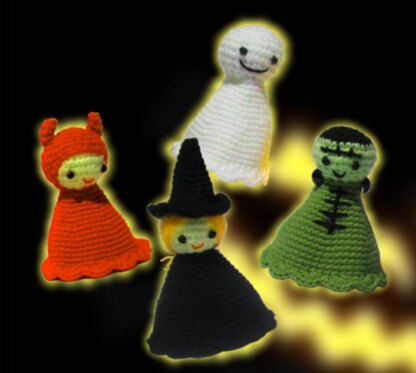 This crochet pattern is written in English (using US crochet terms). It is 6 pages long with detailed instructions and ten pictures to help you make the Halloween gang.