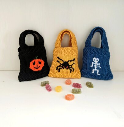 Knitting Pattern for Fun Treat Bags for use on Halloween.