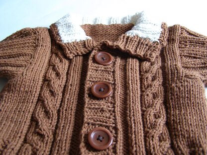 This handsome little cardigan was inspired by the pullover worn by Ron Weasley in “Harry Potter and the Deathly Hallows, Part 1”. It will be an excellent addition to any young man’s wardrobe, with its eye-catching cables and chunky buttons. Made of worsted weight yarn, this sweater will knit up quickly, and is sure to charm your young wearer!