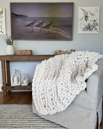 The raised welts create a soft, sculptural look that fits perfectly in cozy home décor, minimalist interiors, and neutral coastal spaces. The blanket grows quickly on size 50 (25 mm) needles, and the slipped-stitch edges keep the finish crisp and polished.