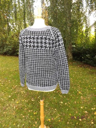 This is a sweater/pullover worked from the bottom edge and up with a 2-color allover pattern. The sweater has a combined round and raglan yoke and sleeve construction. The Sweater has traditional rib edges. The pattern is made for at yarn with a gauge of 18 stitches per 10 centimeters (2-color stockinette stitch) i.e. a yardage of approximate 90 meters per 50 grams. Pictured in Sandnes Peer Gynt / Mor Aase.