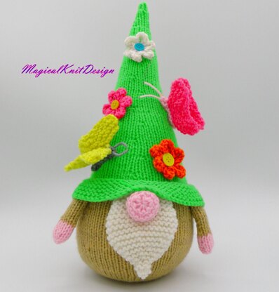 This is Hans the Spring gnome, knitted flat with straight Knitting needles, easy to follow pattern, with row by row written instructions and photo-tutorial.