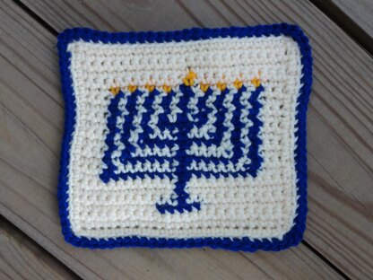 Hanukkah Square, worsted weight yarn, Ivory (30 yds), Blue (15 yds),Yellow (3 yds)(approximate amounts). Example in photo in Knit Picks Brava Worsted, Cream, Celestial and Caution. The square with tapestry crochet menorah motif is worked in rows and finished with an edging worked in the round. Chart included. 3.75mm F hook.