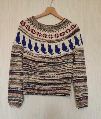 Cats is worked seamlessly from the top down. First some short rows are worked back and forth to create a higher back neck and then the yoke is worked top down, in the round, to sleeve separation.