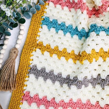 The Happy Go Granny Blanket is made with Paintbox Yarns Simply Aran. With 60 colours to choose from, you can mix and match for a unique look. The sample features colours Washed Teal, Mustard, Blush Pink, Taupe, and Champagne White for a fresh, modern look.