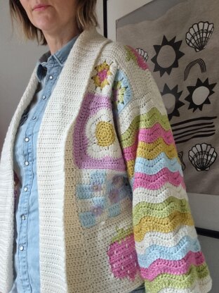 Made of patchwork squares inspired by all things spring, from the first daisies to the start of the strawberry season, this jacket is the perfect cover‑up to keep away that spring chill.