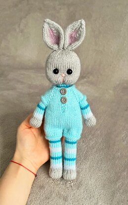 This is a pattern for a stuffed toy hare in a romper. The toy and the romper are knitted flat on 2 needles and then sewn. For the hare’s body, legs and arms I used different oddments in the blue range. You can knit in one plain color or use a self-striping yarn.