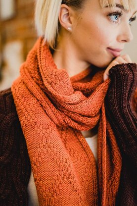 Jumbo diamonds etched in double moss stitch emboss the surface of this generously-sized scarf. The reversible pattern, worked entirely in knits and purls, is echoed in double-knotted fringe, perfect for every level of knitter.