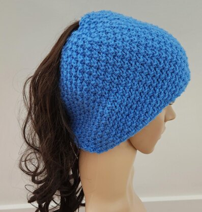 This warm and cosy 12ply ponytail/messy bun Beanie is worked in double moss stitch throughout. It can be worked in one or two colours and it is worked in rounds, using double-pointed needles.