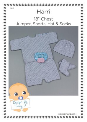 Harri is a Baby Knitting Pattern for a short-sleeved jumper, shorts, socks and a hat to fit a baby 18" chest and is made using DK yarn and 4mm needles. This Baby Knitting Pattern requires 200g of DK yarn