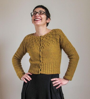 This is a cropped cardigan mostly worked flat from the top down, with one chart included for the yoke and minimal finishing. The pattern features a circular yoke with cables, lots of texture and optional short-row shaping.