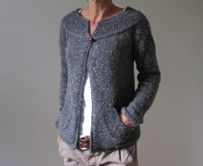 This cozy cardigan is worked from the top down, and requires only a minimal amount of seaming. The collar is worked first in sideways garter stitch and then the stitches for the yoke are picked up along the long edge of the collar. The yoke, sleeves and body are then worked down in one piece. The pattern includes detailed instructions for the pockets, which are not complicated! Also included are instructions for i-cord edges, but you can work garter edges if you prefer to avoid i-cording. I think it is best worn with about 1 or 2 inches of positive ease. Sizing is easily customized by adjusting the number of stitches cast on under the arms.