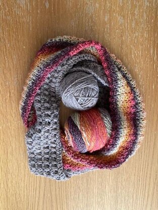 This cowl is formed from two interlinked rings of slightly different lengths. Recommend using a patterned (ombre, variegated, gradient, or other) yarn for one ring and a coordinating solid for the other. Either or both rings can have a mobius twist if desired. The rings can be worked at the same time and the width and length can be varied to achieve a custom look.