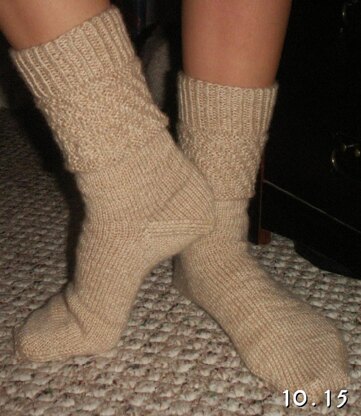 This is a great pattern for a beginner in socks. There is a simple stitch detail that follows a twisted rib cuff and an inserted heel. The worsted weight yarn means that the socks will work up quickly for instant gratification.