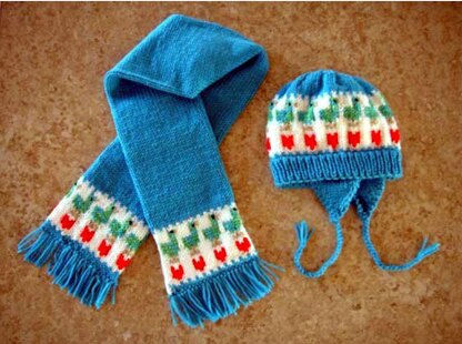 Cute, clever design, will fit children 2 to 6 yrs. A very easy colorful graph to repeat across row. This is very easy to do, even if you have not done much color knitting. Uses worsted weight yarns and US # 7 needles, worked back and forth, so no double points here! The cute duck pattern is knit in, and like we said, it is a very, very easy color graph, not too many rows to complete! The earflaps help keep toddlers and children warm too. Scarf is 4½ wide, and 38 long. You can make longer before you start the last graph for opposite end. Make in bright colors for all the kids and grandkids!