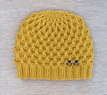 The idea for this hat came from my friend Kathy who asked me if I could design a hat in a stitch that looks like honeycomb. She even sent me the cute bee buttons for inspiration! Thank you so much, Kathy! : )