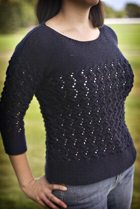 The Haubergeon Pullover is inspired by medieval chain-mail armor, updated with lace for a touch of femininity. Knit in a sport weight wool-blend, this top will be a perfect layering piece and add that extra bit of warmth needed on a cool fall day. The garter stitch yoke and deep hems contrast the meandering lace panel on the body and sleeves.