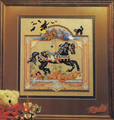 By Linda Gillum. A haunted carousel horse might just scare you enough to stay home on Halloween and stitch this whimsical design. Full of Halloween items, this design is so lovely, you might want to display it year round.