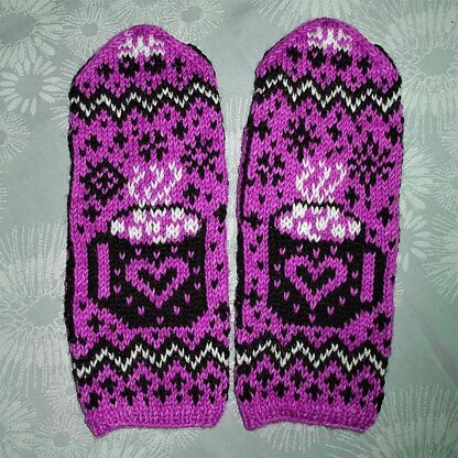 Have a Cocoa mittens are designed for thicker yarns (sport or DK) to keep your hands warm while you are out playing or working. The mittens feature a mug of hot cocoa with melting marshmallows to give you a warm and cozy feeling of happiness and love.