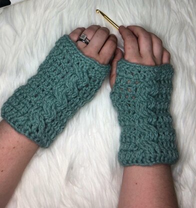 These lovely fingerless gloves are perfect for crocheters who want to extend their skills just a little bit and learn a new way to create something that was only for knitters for the longest time. You can use almost any acrylic or acrylic wool blend, but I recommend Wool Ease due to how it holds the cables up but is still soft and stretchy enough for fingerless gloves. Your cables will pull on your stitches and it will be “smaller” at the top than the bottom, but as long as you are counting your stitches, they stretch to where they should be once on. These are very simple cables, only 6 bars across so you don’t have to worry about getting them confused as you might with the larger cables you can create. Stitch markers are you friends here =]. If you have any questions, feel free to send me an email