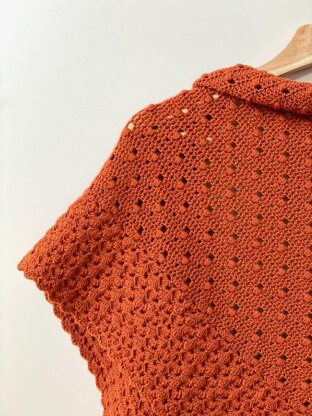 Hazel Dots Shawl is a lovely triangular shawl featuring a textured body with geometrically placed puff stitches and a large border with flower stitches.