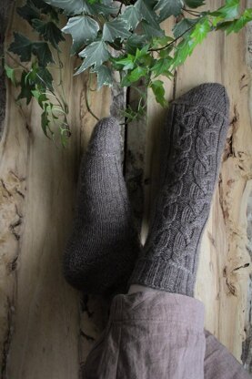 Worked top-down, featuring an intuitive yet eye catching cabled panel framed by horizontal braids. These socks feature a 2x2 cuff and short row heel.