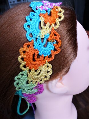 A colorful headband, ideal for holding hair in summer. It is based on an old lace stitch, updated with the use of multicoloured cotton. The spiral technique allows the headband to be hooked at once, without having to assemble pieces one after the other. The realization is easy enough and requires just a little concentration to follow the necessary rotation of the structure. The progress is well explained step by step anyway. The model on the picture is made of medium cotton but it can be made with a finer yarn for a "lace" effect. The PDF tutorial includes a main diagram and 13 detail diagrams as well as a step-by-step explanation with 73 photos.