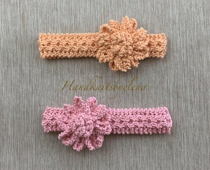 The band is knitted sideways. The flower is knitted separately and sewn to the band. The pattern includes written instructions and pictures showing how to make the flower.