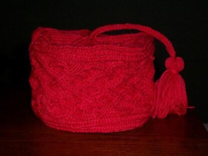 The cable pattern (with built-in I-cord edge) is worked flat until desired length and then turned on its side so sts can be picked up for the flat crown. The tassel is attached by a knitted-in I-cord. Sized child large/adult small with additional directions for adult med/large!