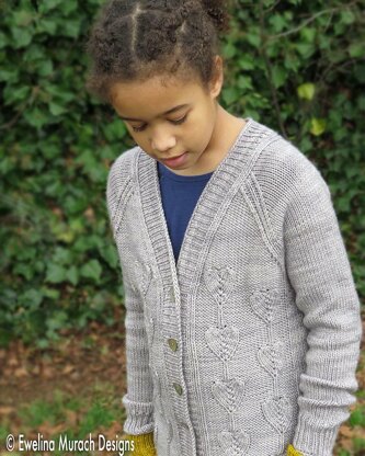 Heart Cardigan is a seamless, relaxed-fit cardigan featuring heart pattern panels at the back and fronts, and 1x1 rib at the sides. The body is worked bottom up to the underarms, with little shaping, then sleeve stitches are provisionally cast on and the yoke is continued, with raglan decreases and v-neck shaping. The sleeves are worked top down, from the stitches provisionally cast on at the start of yoke, so their length can be easily adjusted.