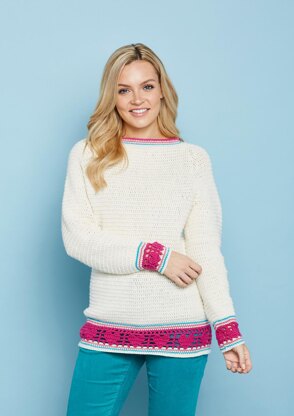 The pattern starts with making two sleeves, starting at the cuff, the body is worked seamlessly in round from the bottom up with the sleeves joined as you go. The finished construction is raglan style with decreases worked on the round yoke.