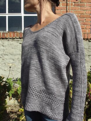 The sweater is knitted from top down seamlessly. You will begin with the shoulder bands in rib, then you will pick up stitches along the shoulders and knit the back to the armholes. Then you will put the back stitches on hold to knit the front to the armholes, finally you will join to knit the back and front together in the round until the end, including a lace band at the bottom of the sweater. The sleeves will be knitted in the round, picking stitches around the armhole. You have an option to knit the lace band sleeves with a contrasting color. You can knit the shoulder bands, the neckline, the lace sleeves of another color.