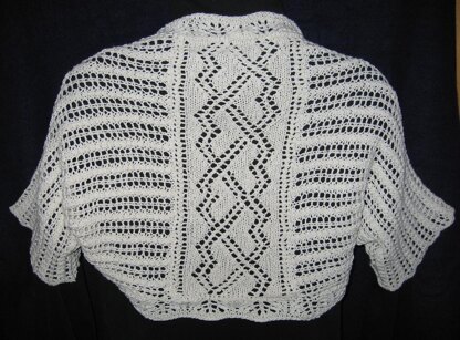 I was asked to design a shrug for a wedding dress; and, of course, thought that I needed to incorporate hearts into the design. The hearts are at the center back with a lace ribbing attached. The border around the shrug can be worked in any number of rows. The number of rows will change the look from a border just below the underarms to something that will increase the left and right front and give you a little collar.