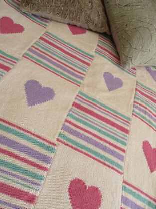This is a pattern for Hearts and Stripes throw, originally designed for Knit Today. It is made in Rowan Handknit Cotton, in squares, in a mixture of stripes and a simple intarsia. The edge is finished in crochet. It can be made to a different size according to how many squares are used.