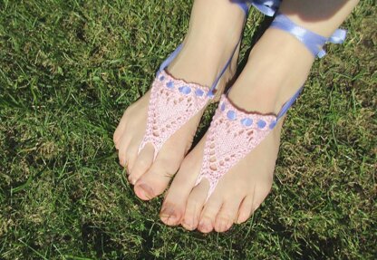 A pattern for barefoot sandals. These can also be used as hand accessory. Size can easily adjusted by using different needle size and/or adding/removing rows where shown.