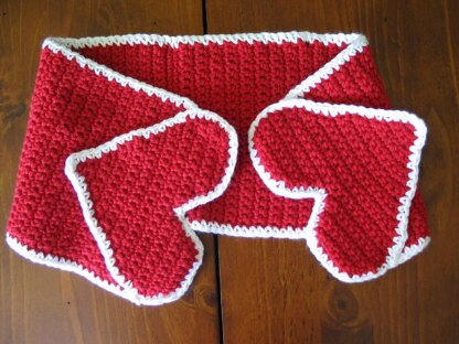 These mittens fit over your hands to move hot casserole dishes. Great Mother's Day, Valentine's Day or house warming gift for someone special. Pattern works up quickly in single crochet. The main portion of the mittens are made by working on both sides of the starting chain. The two hearts are made separately and then crocheted onto the "arms" while working the white border.