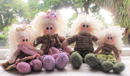 These delightful dressed dolls are approx. 11 inches high and are suitable for intermediate knitters. Their small toys are approx. 7 inches high. They are worked flat and seamed.