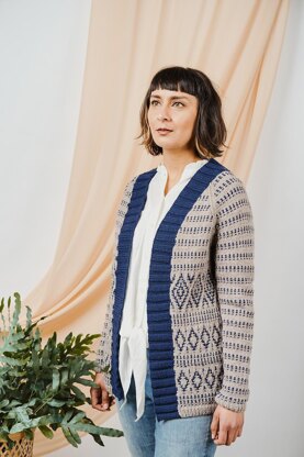 SARAH HATTON’S design for a hip-length, open-fronted cardigan features a colourwork pattern with a woven effect. The stranded colourwork uses purl stitches on the right side of the fabric, to give a subtle textured feel. The body is worked in one piece to the armholes, and then divided for the fronts and back; the sleeves are worked flat.